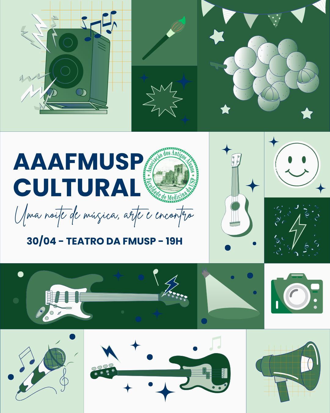 No dia 30/04, a AAAFMUSP realiza mais uma edição do AAAFMUSP Cultural no Teatro da FMUSP, reunindo arte, música e solidariedade.